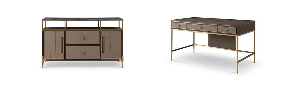 餐桌以简洁干练造型为主,高级百搭的灰色调,软包真皮,金属镶嵌的细节,打造出悠闲奢华、优雅精致的风格,让家的味道从一日三餐中抵达内心深处。